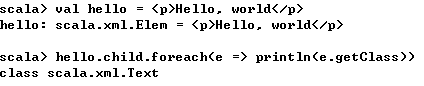 当处理Scala的XML库时,该方法非常有效,可以知道在不同情形下所处理的类,如下,<p>标签下包含了一个子类