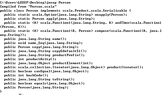 当使用scala编译器编译case类时,你会发生其生成了两个文件,Person$.class和Person.class文件,当使用javap反编译Person$.class文件时,其输出如下