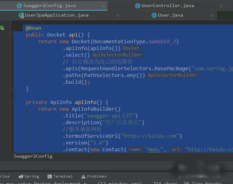 编写Swagger配置类Swagger2Config,在类上增加@Configuration和@EnableSwagger2注解,表明这是一个配置类,同时开启Swagger。如下的信息可以根据具体情况修改。