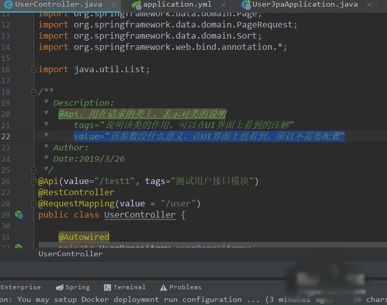 接下来我们需要在Controller层添加注解,@Api(value="/test1", tags="测试用户接口模块"), @Api这个注解是用在请求的类上,表示对类的说明,其中tags="说明该类的作用,可以在UI界面上看到的注解",value="该参数没什么意义,在UI界面上也看到,所以不需要配置"。该注解的使用如下图所示。