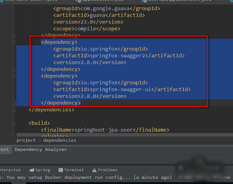 <dependency> <groupId>io.springfox</groupId> <artifactId>springfox-swagger2</artifactId> <version>2.8.0</version> </dependency> <dependency> <groupId>io.springfox</groupId> <artifactId>springfox-swagger-ui</artifactId> <version>2.8.0</version> </dependency>