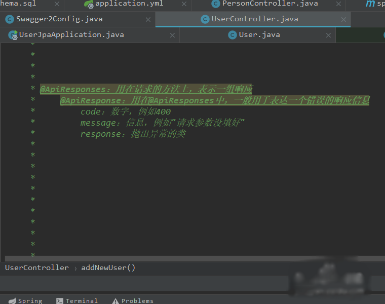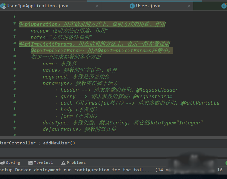 接下来我们需要在方法上添加注解了,如下所示,@ApiOperation、@ApiImplicitParams、@ApiImplicitParam的作用如下图所示。@ApiResponses:用在请求的方法上,表示一组响@ApiResponse:用在@ApiResponses中,一般用于表达一个错误的响应信息。