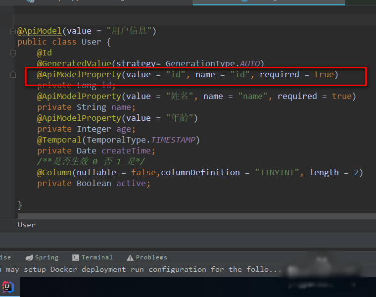 接下来我们介绍传实体类参数的注解怎么写,要使用到@ApiModel、@ApiModelProperty,具体的用法如下图所示。在接收参数的实体类上我们需要添加这两个注解,如下图所示。