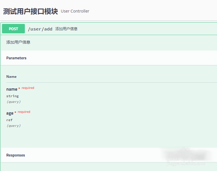 接下来我们测试UserController中的接口,如下图所示,生成了UserController所有的接口文档,我们首先来看添加用户接口,如下图所示,为什么Integer类型的age字段,在生成的接口文档中参数类型变成了ref呢?上文提到过的,在写注解的时候,dataType = "Integer"要省略掉,不然会出现这个问题。正确的如下所示,可以看到age为Integer类型了。