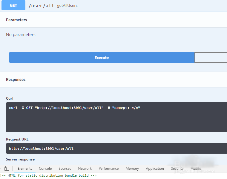 接下来我们看一个Get请求,这个请求不需要传参,直接执行即可,结果如下图所示。我们可以看到Swagger生成的restful形式的接口文档,非常方便调试。