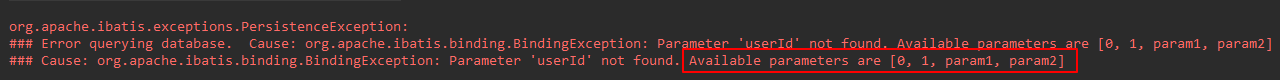 报错信息中说未找到参数userId,可用的参数是[0,1,param1,param2],也就是说我们将代码修改为:
