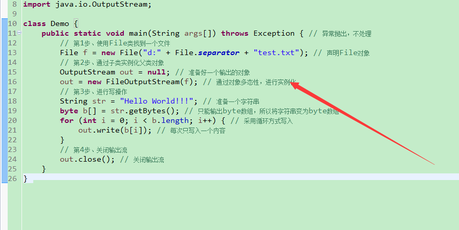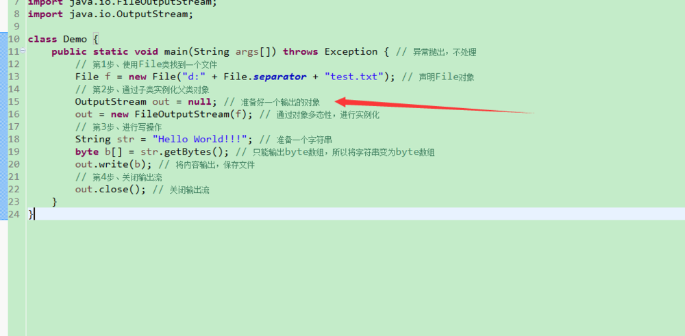 ,OutputStream是Io包中输出流最大父类,此类是抽象类,如果想要使用此类,必须通过子类实现,比如FileOutputStream