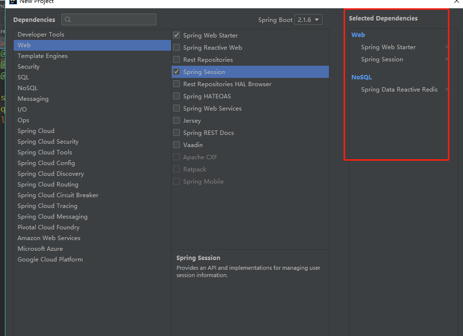 使用idea创建SpringBoot工程, 添加组件Web、Spring Session和Redis。 我这里idea是2019版本,SpringBoot是2.1.6。