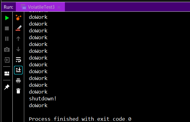 1. volatile关键字的作用:保证了变量的可见性(visibility)。被volatile关键字修饰的变量,如果值发生了变更,其他线程立马可见,避免出现脏读的现象。如以下代码片段,isShutDown被置为true后,doWork方法仍有执行。如用volatile修饰isShutDown变量,可避免此问题。