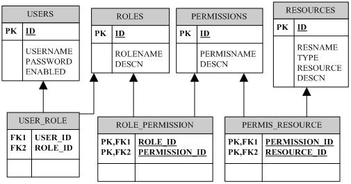 同时,为了更好地配合Acegi安全框架,还引入resource(资源)的概念,资源可分为URL和FUNCTION(方法)两种,一个权限可以对应多个资源。具体的数据库设计见图2。