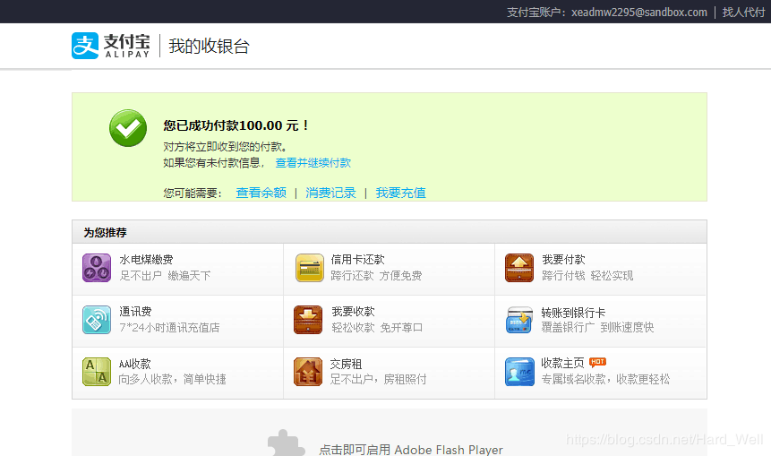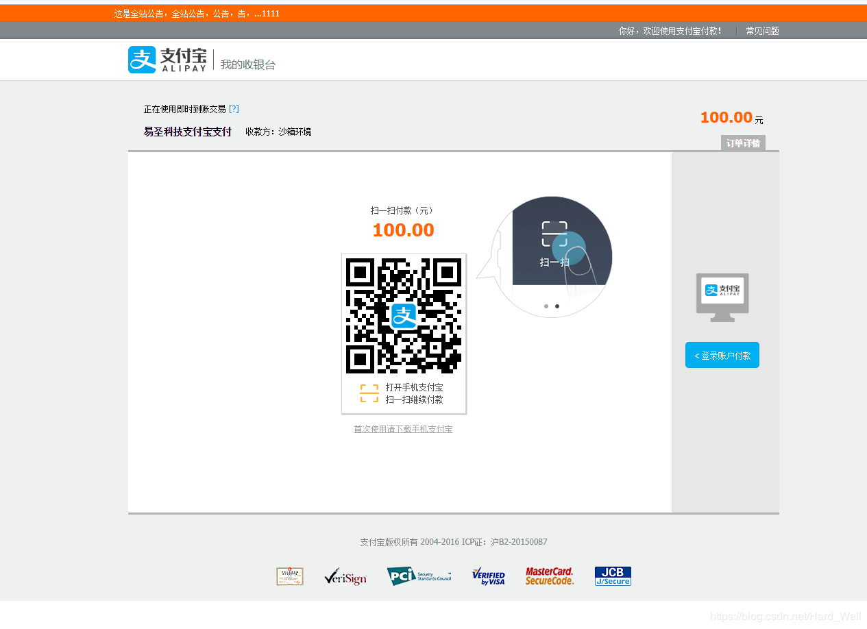 注意:扫码或者登陆账户时如果用的是沙箱开发环境请使用沙盒支付宝APP扫码,或者使用沙盒账户支付,否则会弹出码已失效错误