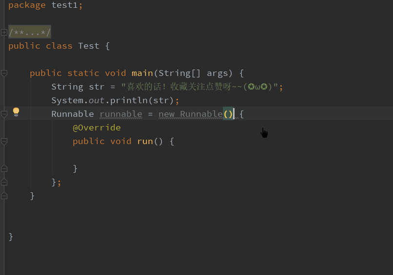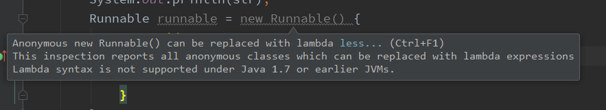 中new Runnable()是灰色的,IDEA提示:需要使用lambda表达式来代替匿名内部类。