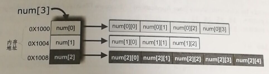 下面的语句是声明整型的二维数组num并分配空间,其中第1行4个元素,第2行3个元素,第3行5个元素
