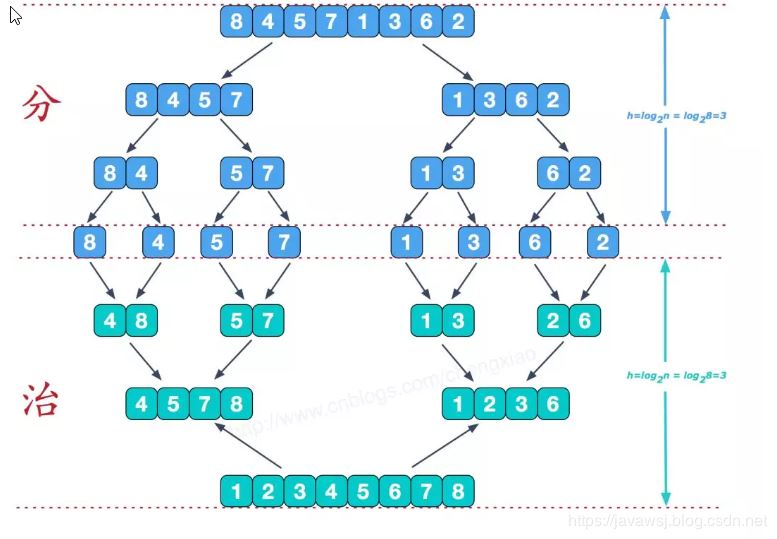 可以看到这种结构很像一棵完全二叉树,本文的归并排序我们采用递归去实现(也可采用迭代的方式去实现)。分阶段可以理解为就是递归拆分子序列的过程,递归深度为log2n。
