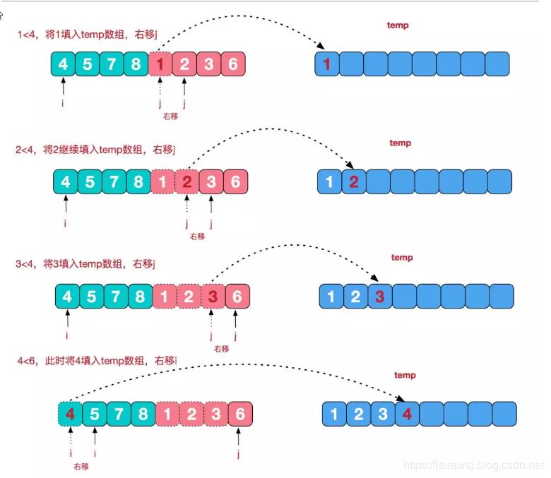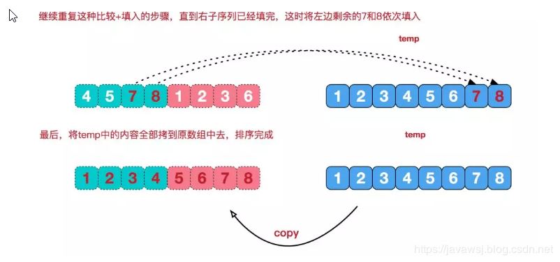 再来看看治阶段,我们需要将两个已经有序的子序列合并成一个有序序列,比如上图中的最后一次合并,要将[4,5,7,8]和[1,2,3,6]两个已经有序的子序列,合并为最终序列[1,2,3,4,5,6,7,8],来看下实现步骤。