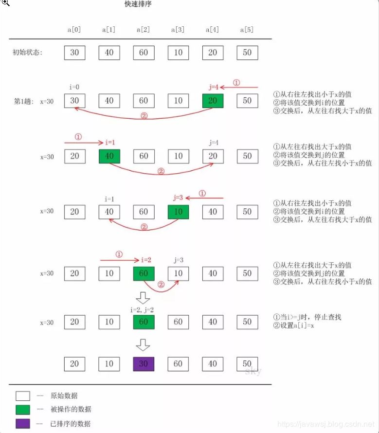 它的基本思想是:选择一个基准数,通过一趟排序将要排序的数据分割成独立的两部分;其中一部分的所有数据都比另外一部分的所有数据都要小。然后,再按此方法对这两部分数据分别进行快速排序,整个排序过程可以递归进行,以此达到整个数据变成有序序列。