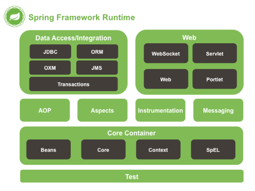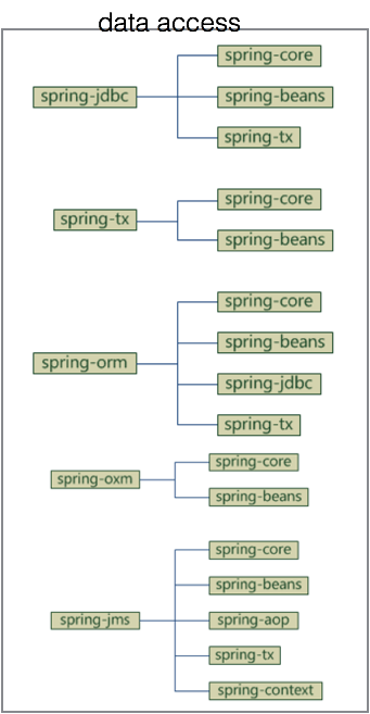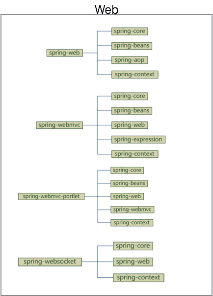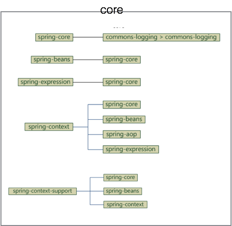 图中可以简单认为将spring分为5个部分:core、aop、data access、web、test,图中每个圆角矩形都对应相应jar包,如果在maven中配置,所有这些jar的“groupId”都是“org.springframework”,每个jar有一个不同的“artifactId”,官方给出总共20个JAR包