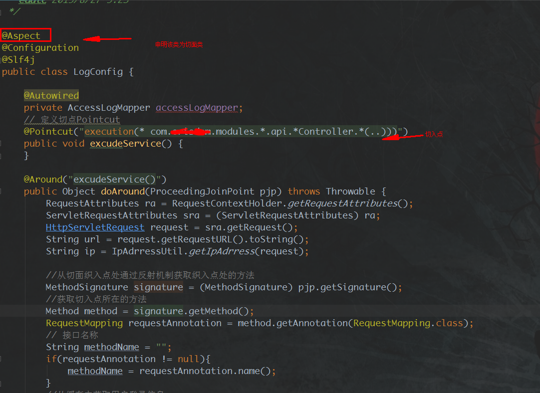 2.定义个切面类,并指定切入点,获取所需记录信息(如:访问人IP, 访问地址,访问地址名称等)