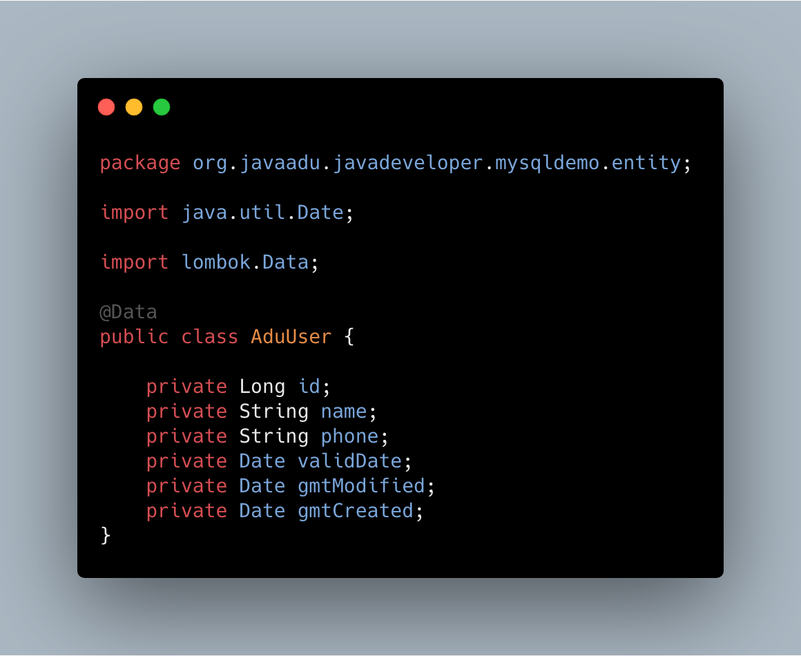 使用spirngboot + mybatis作为开发框架,定义一个用户实体,代码如下所示: