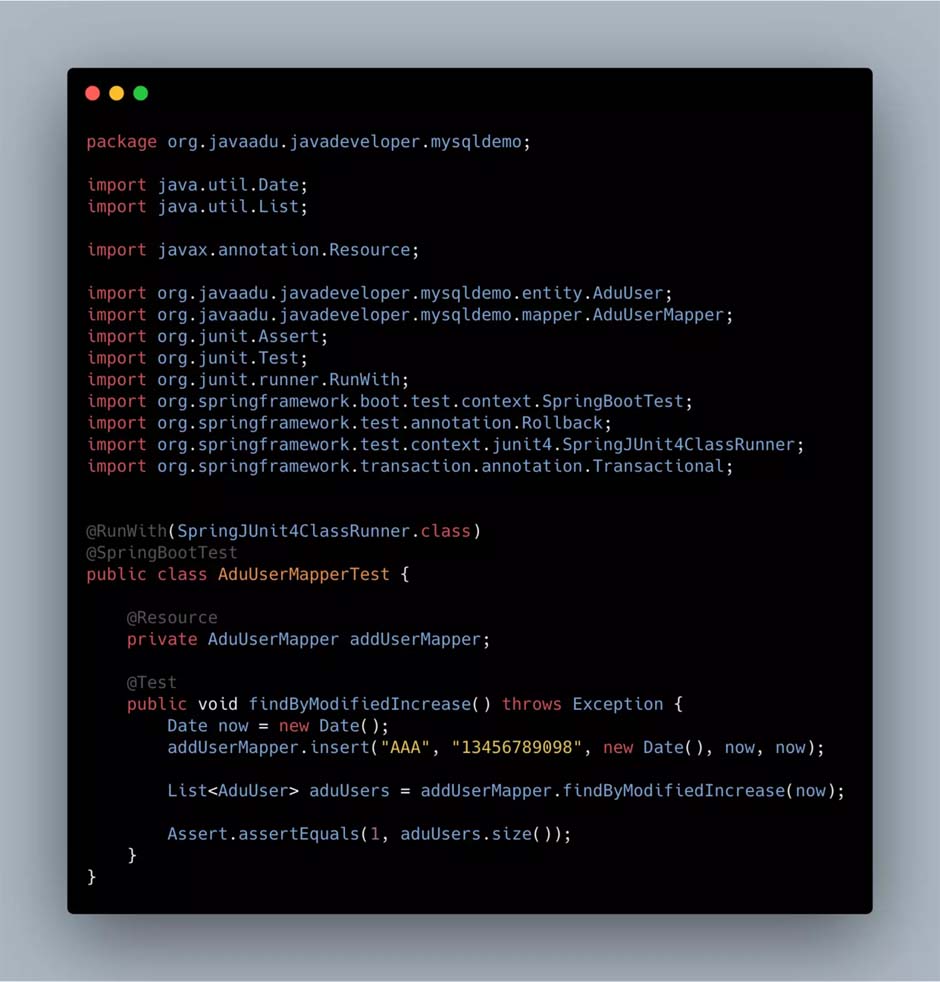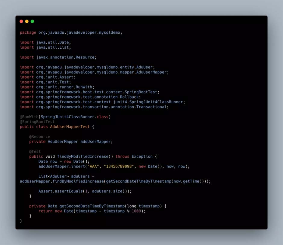 编写测试代码,先插入一条数据,然后用时间戳作为查询条件去查询,代码如下: