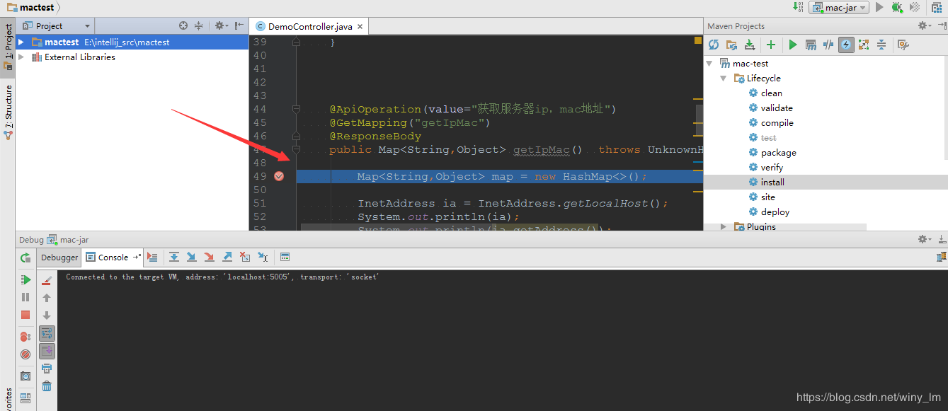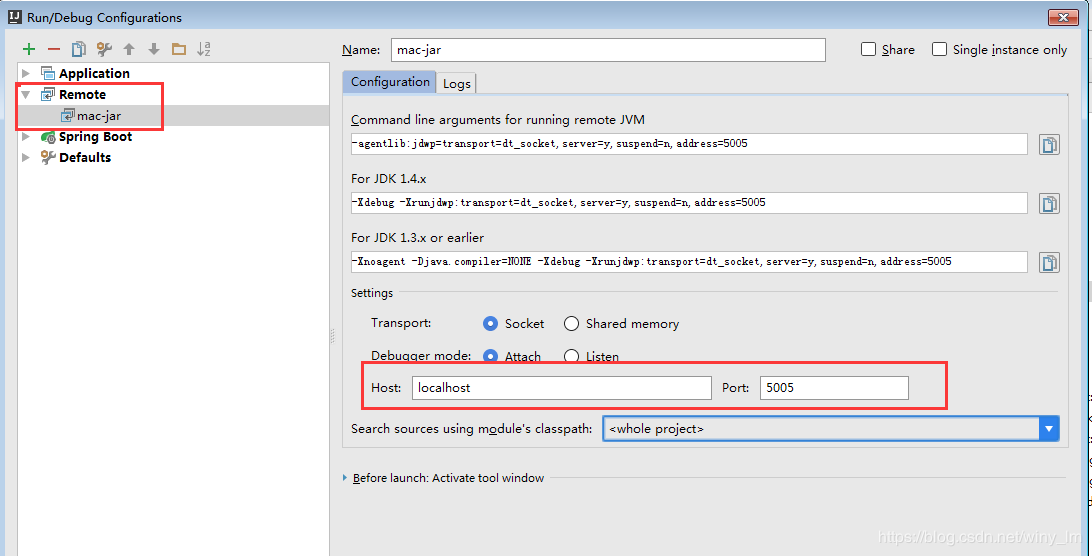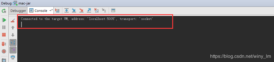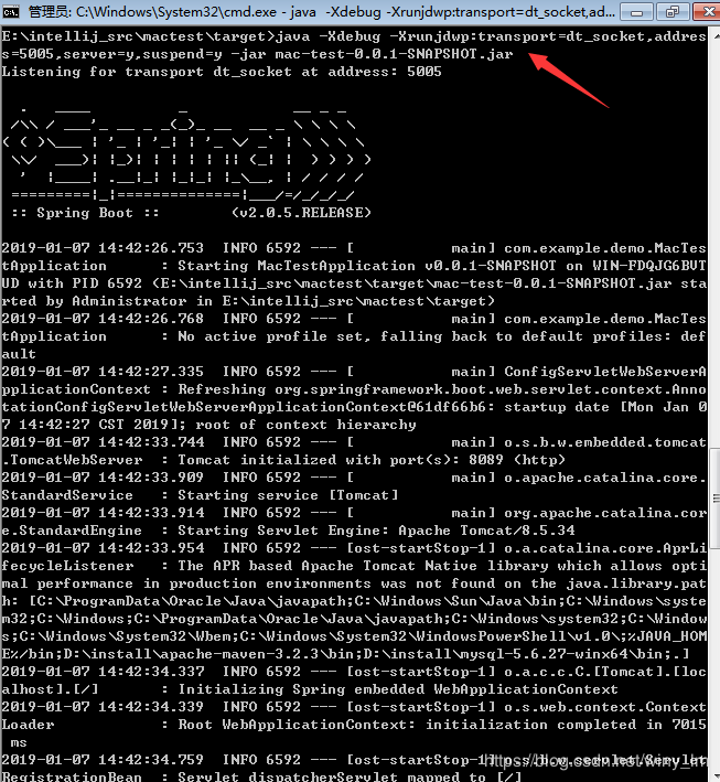 // 找到对应的jar包目录,cmd窗口中执行下面语句即可java -Xdebug -Xrunjdwp:transport=dt_socket,address=5005,server=y,suspend=n -jar mac-test-0.0.1-SNAPSHOT.jar
