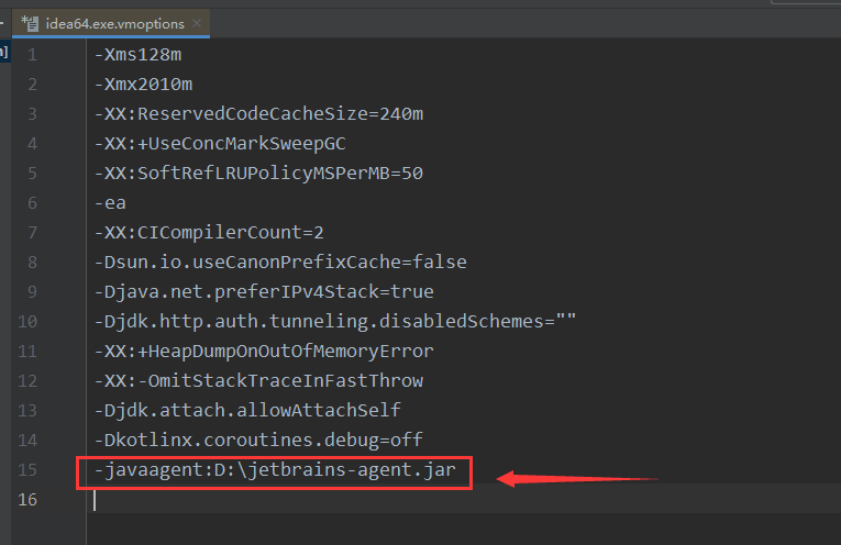注意:D:\jetbrains-agent.jar是我存放破解补丁的位置,你可以自定义成自己存放的位置,注意目录中不要带有中文。注意:因某些限制,最新激活码、破解补丁已放置在笔者公众号上,请关注微信公众号: Java技术迷, 回复关键字:200903, 即可免费无套路免费激活码、破解补丁,持续更新中~。