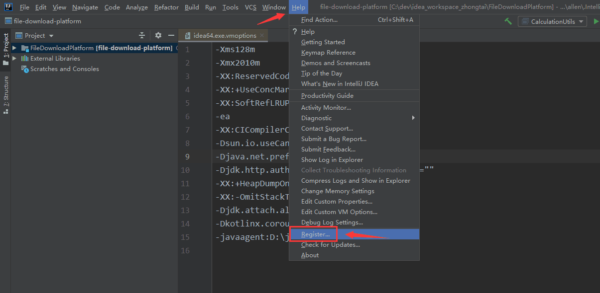 成功进入 IDEA 以后,我们随便创建一个项目/或者打开个旧的项目,点击顶部的 Help 菜单 -> Edit Custom VM Options: