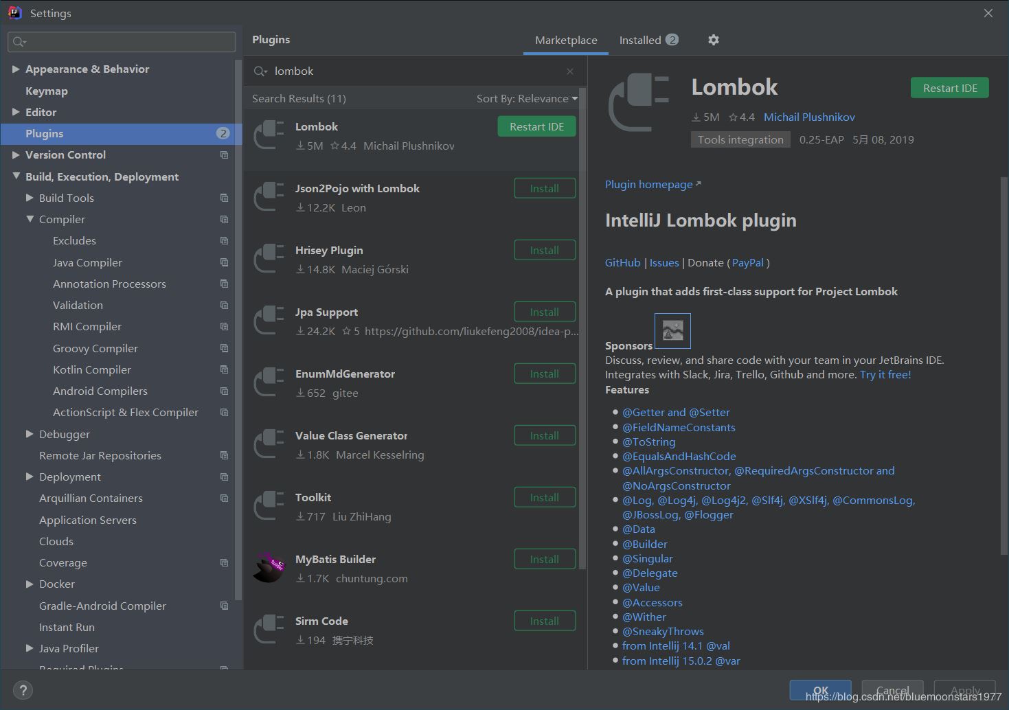 (1)按键 Alt+Ctrl+S,打开Settings对话框,安装lombok插件。
