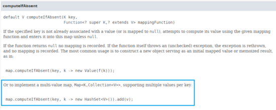 事实上,本文使用 putIfAbsent 时是存在问题的, positionsMap.putIfAbsent(str, new ArrayList<>(1)) ; 这句代码每次调用时都会产生一个临时的 ArrayList —— 当遍历的 List<String> 较大时,这可能会带来一定的负面影响;相比之下 compute 和 computeIfAbsent 的好处在于,它们接受的参数为函数,只会在必要时才使用函数进行计算得出新 value 。在本文类似需求的情况下,就适用性和简洁性而言, computeIfAbsent 要优于 compute 。在 JDK1.8 的 API 文档中,也说到在需要生成一个类似于 Map<K, Collection<V>> 的结构时, computeIfAbsent 很适合这种情况: