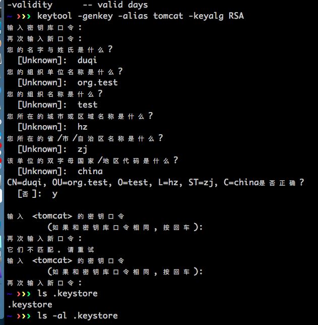 如果你使用Unix或者Mac OS,可以通过下列命令:keytool -genkey -alias tomcat -keyalg RSA,在生成过程中可能需要你填入一些自己的信息,例如我的机器上反馈如下: