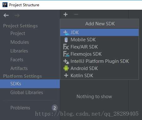 在打开的页面中,选择SDKs属性,并点击中间的加号+,选择JDK,如下图