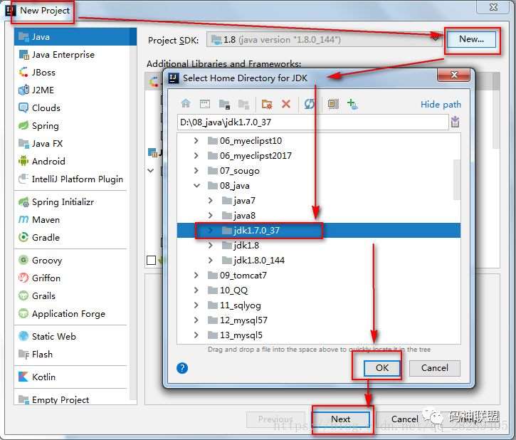 在打开的窗口中,选择按钮New,然后选择对应的JDK版本,点击OK按钮,然后Next创建项目,并使用配置的JDK,如下图