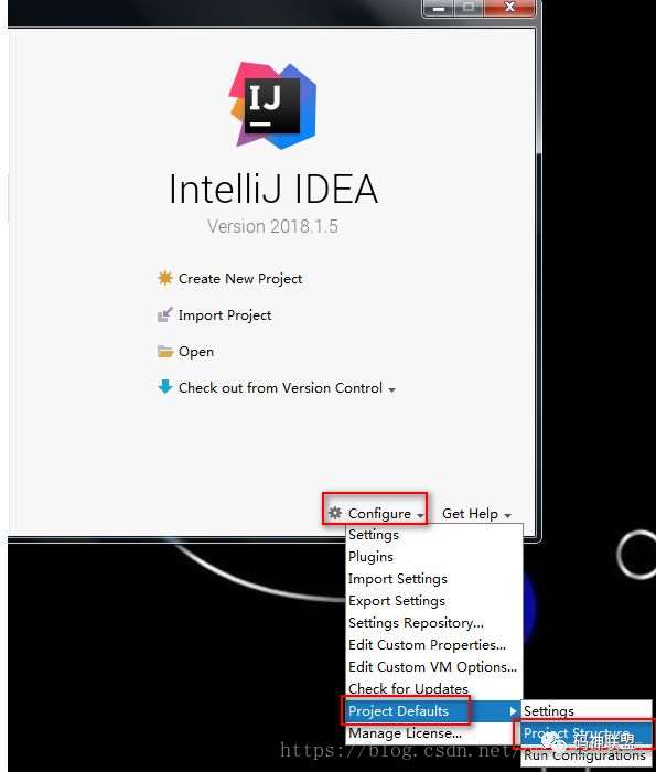 在IDEA启动页面中,下拉Configure,选择Project Defaults -- Project Structure,如下图