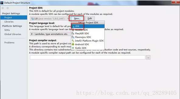 在打开的窗口中,选择Project,然后在详情页面中,选择按钮New,并点击JDK选项,如下图
