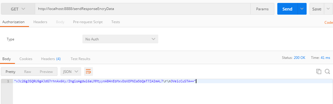 使用postman发请求http://localhost:8888/sendResponseEncryData,可以看到返回数据已加密,请求截图如下: