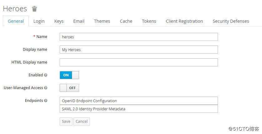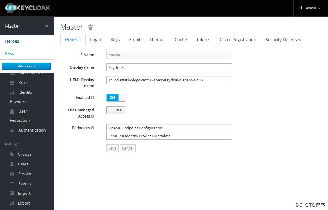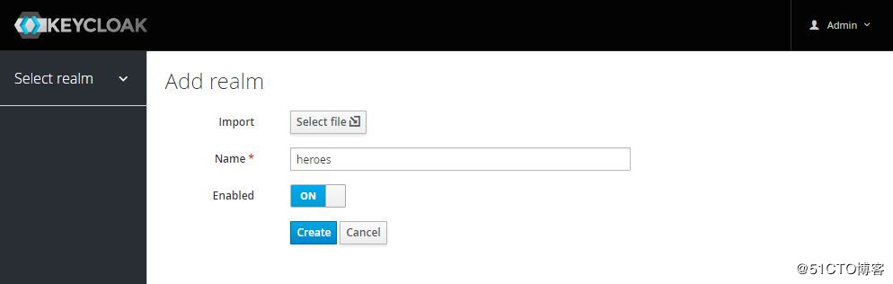 为保护不同的应用,通常创建不同的Realm,各Realm间的数据和配置是独立的。初始创建的Realm为Master,Master是最高级别的Realm。Master Realm内的admin用户(授予admin角色的用户)拥有查看和管理任何其它realm的权限。因此,不推荐使用master realm管理用户和应用,而应仅供超级管理员来创建和管理realm。每个realm有专用的管理控制台,可以设置自已的管理员账号,比如接下来我们创建的heroes realm,控制台网址为http://localhost:8080/auth/admin/heroes/console 。创建Heroes realm,点击左上角下拉菜单-》Add realm: