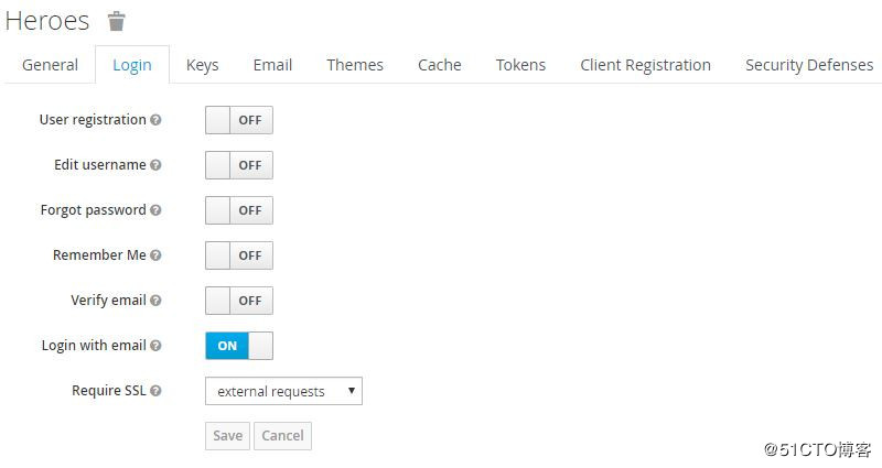 Login Tab中有多个可配置选项:用户注册、编辑用户名、忘记密码、记住我、验证email、使用email登录、需要SSL。