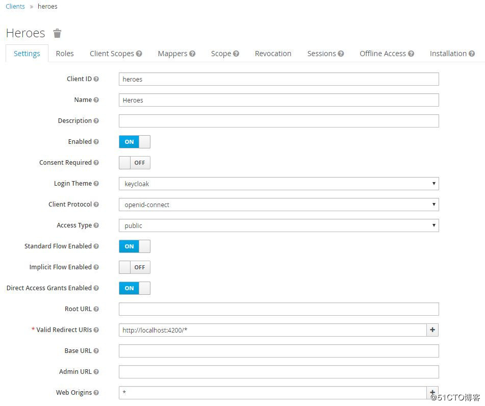 Client Protocol使用默认值openid-connect。Access Type有三个选项confidential、public、bearer-only,保持默认值public。confidential需要client secret,但我们将在web应用中使用此client,无法以安全的方式传输secret,必须使用public client,只要严格使用HTTPS,可以保证安全。Valid Redirect URIs输入 http://localhost:4200/* 。