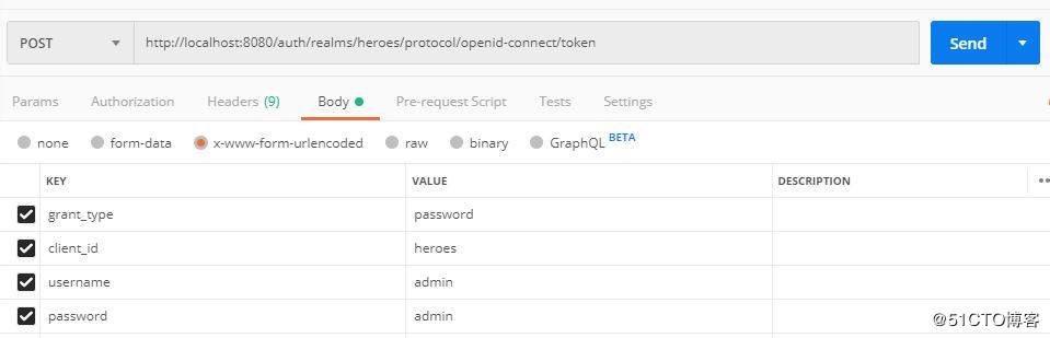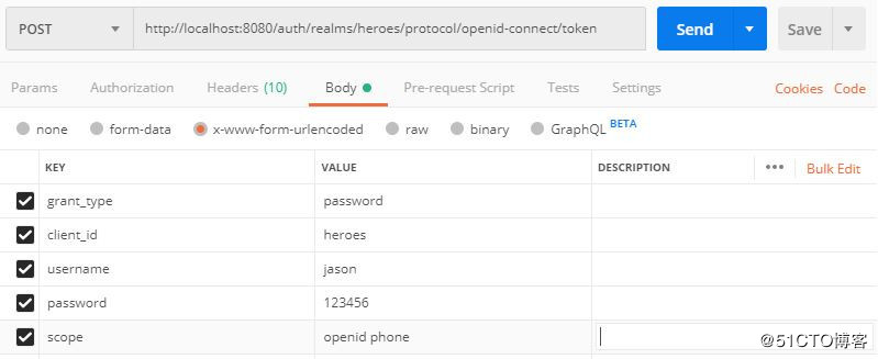 调用示例,请求地址:http://localhost:8080/auth/realms/heroes/protocol/openid-connect/token :