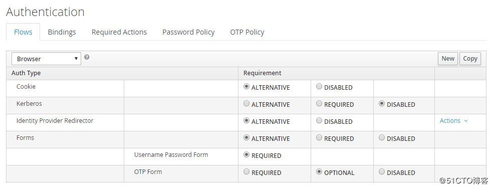 Keycloak预定义了Browser、Direct Grant、Registration、Reset Credentials等认证流程,用户也可以自定义。以Brower流程为例: