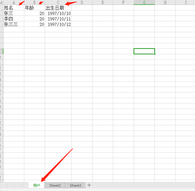 (2)excel中格式如下,注意红色箭头所指的地方 对应user对象中的字段以及sheet名