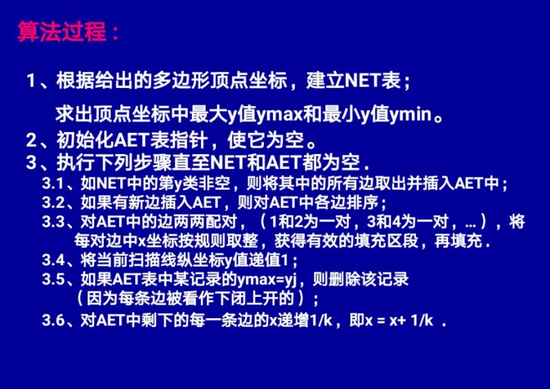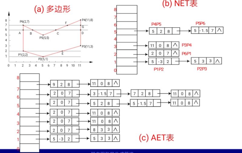 扫描线算法:顾名思义,就是从Ymin开始扫描,然后构建出NET,之后根据NET建立AET。