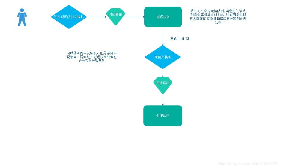 根据上图看出我们需要两个队列(一是死信队列,消息在里面度过TLL时间,二是处理队列,消息度过TLL时间后进入该队列),两个交换机和路由(一是用来将消息送入死信队列,二是将消息从死信队列送到处理队列),但是交换机其实可以用同一个,也就是一个交换机搭配两个路由的方式。