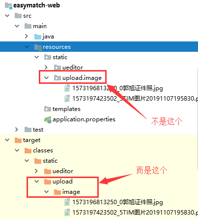 我们知道,如果使用类似 /upload/image/1.jpg 这种格式进行图片的访问的时候,SpringBoot读取的并不是本项目中直接的静态目录,而是在进行编译的时候生成target目录下的文件,如下图所示: