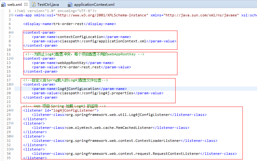 3、容器首先会去读取web.xml配置文件中的两个节点:<listener> </listener>和<context-param> </context-param>