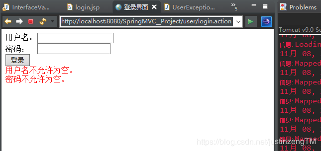 第15行遍历后台发来的allErrors错误信息集合,如果出现校验出错,则显示错误信息。根据我们前面校验器的配置,对于User类对象的数据校验,用户名和密码都不允许为空: