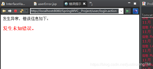 在我们的异常处理器UserExceptionResolver中,第14行首先判断异常类型是否我们的定义的预期异常UserException,如果是,则抛出,否则,创建一个自定义异常类型,并给出错误提示“发生未知错误”。最后第26行,对异常信息处理完后,发送到前端页面进行展示,并跳转到错误提示界面。