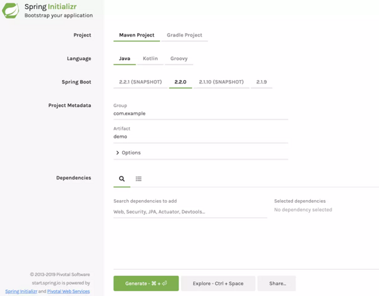 <parent> <groupId>org.springframework.boot</groupId> <artifactId>spring-boot-starter-parent</artifactId> <version>2.2.0.RELEASE</version> </parent>