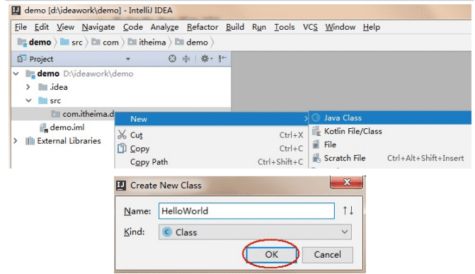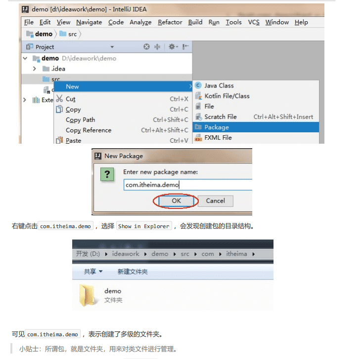 创建包和类1. 展开创建的工程,在源代码目录 src 上,鼠标右键,选择 new->package ,键入包名 com.itheima.demo ,点击确定。