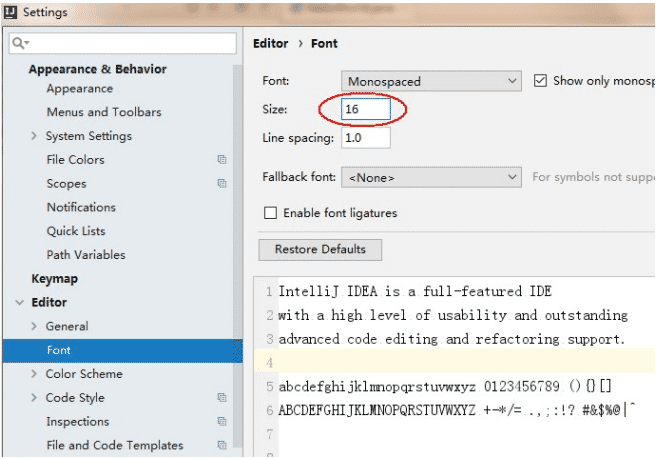 idea的常用设置字体设置IDEA工具的默认字体非常小,代码编辑器和控制台的输出字体都需要进行调整。点击菜单栏上的 File->Settings->Editor->Font 修改字体。
